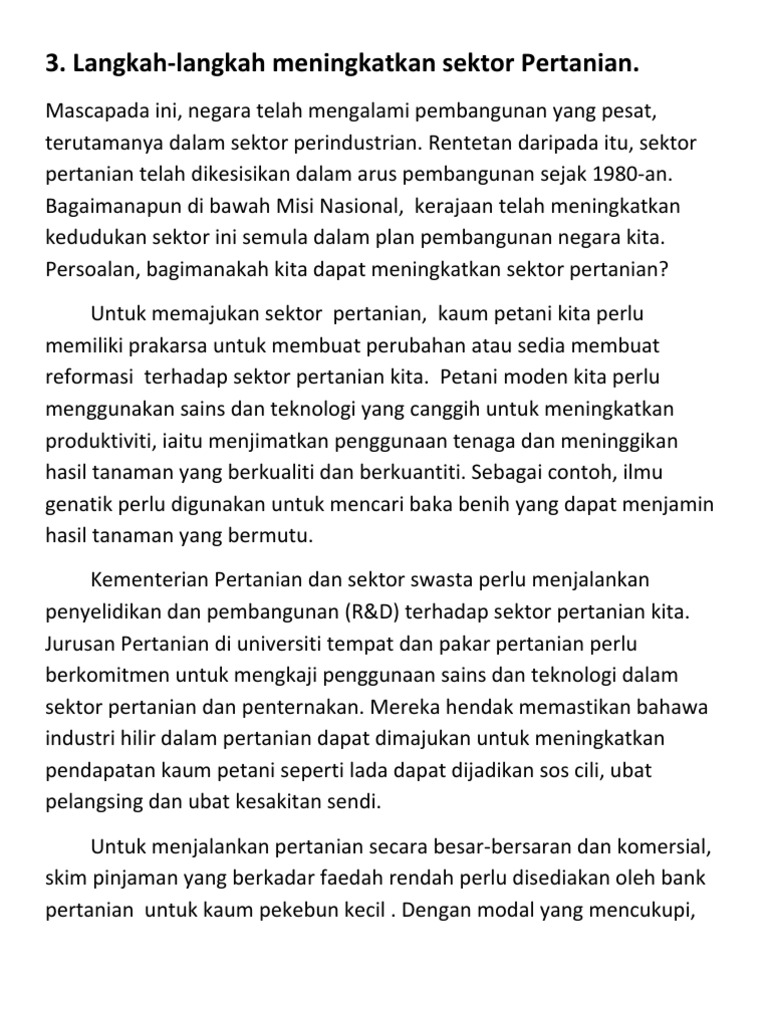 Langkah-Langkah Untuk Memajukan Sektor Pertanian Di Negara Kita : Pastikan semua kabel yang ada telah terpasan dengan baik dan benar.. Sebagai langkah untuk memajukan industri yang amat berpotensi ini 27. Sektor pertanian di malaysia berfungsi sebagai pembekal sumber makanan kepada seluruh penduduk di malaysia. Surat gugatan cerai ini harus mencantumkan alasan menggugat cerai. Memastikan pembangunan negara seimbang kebelakangan ini, kerajaan telah mengisytiharkan usaha membangunkan semula sektor pertanian di negara kita. Sebagai langkah awal, penataan kembali akuntansi sektor publik tentunya perlu dilakukan.